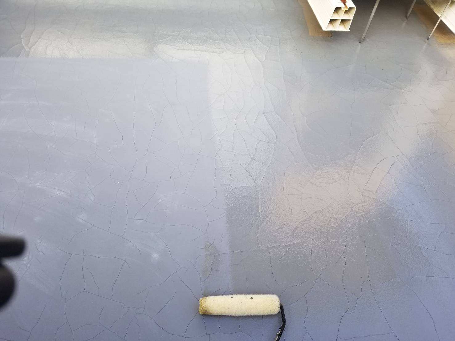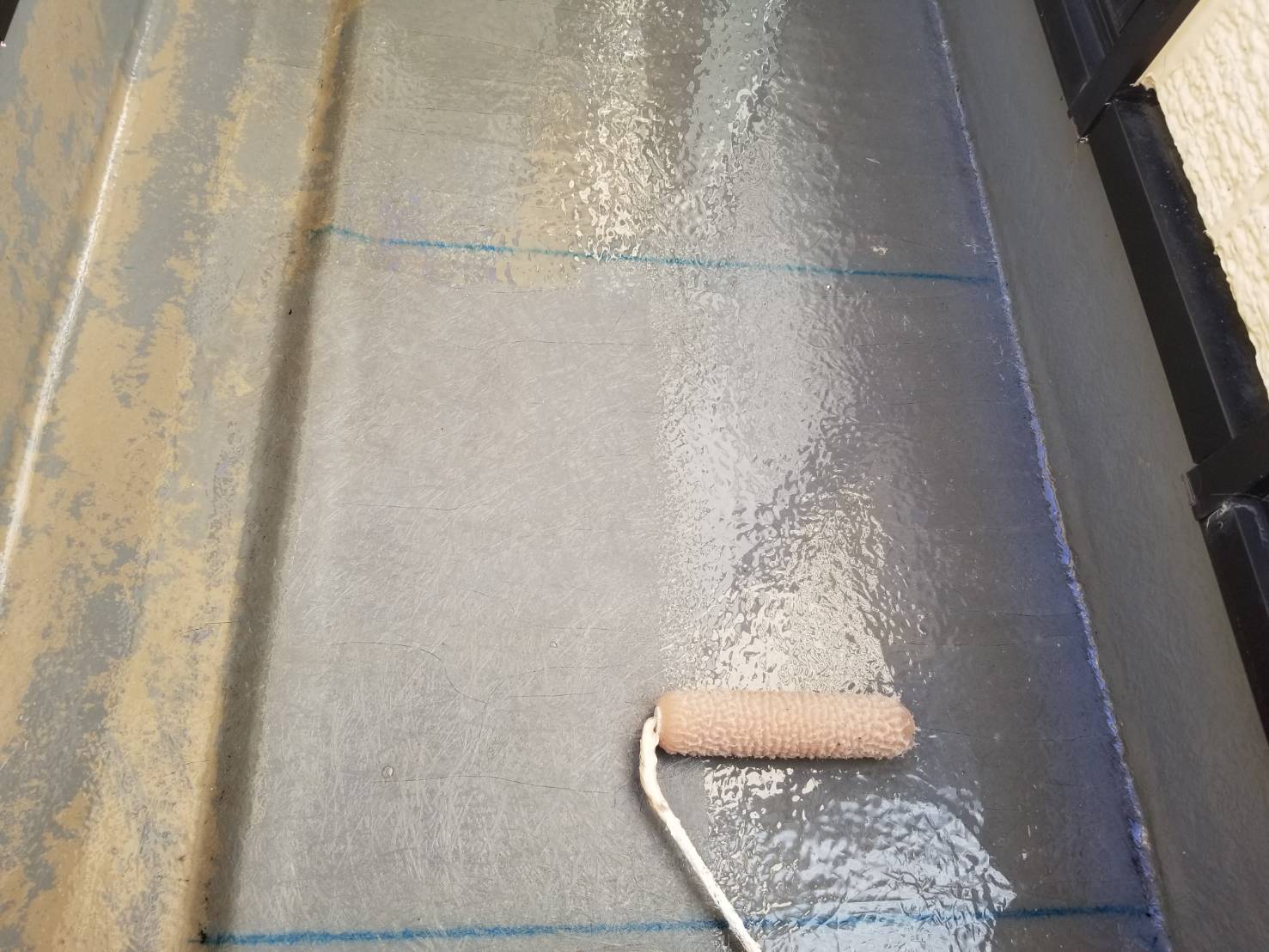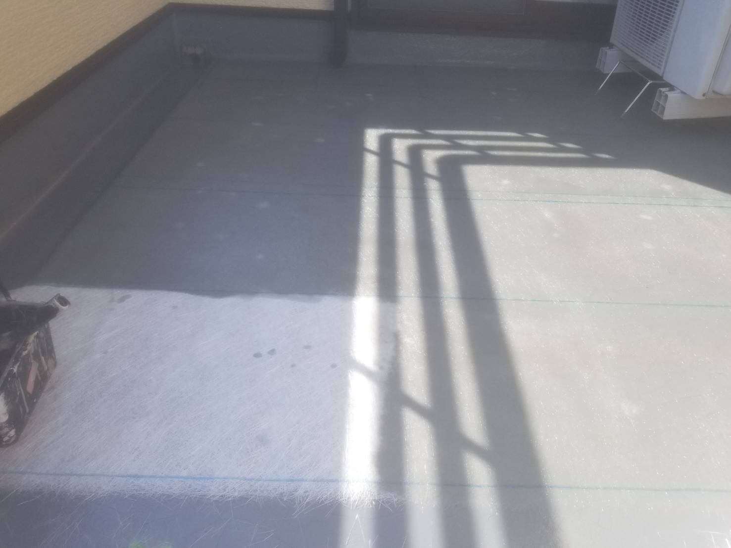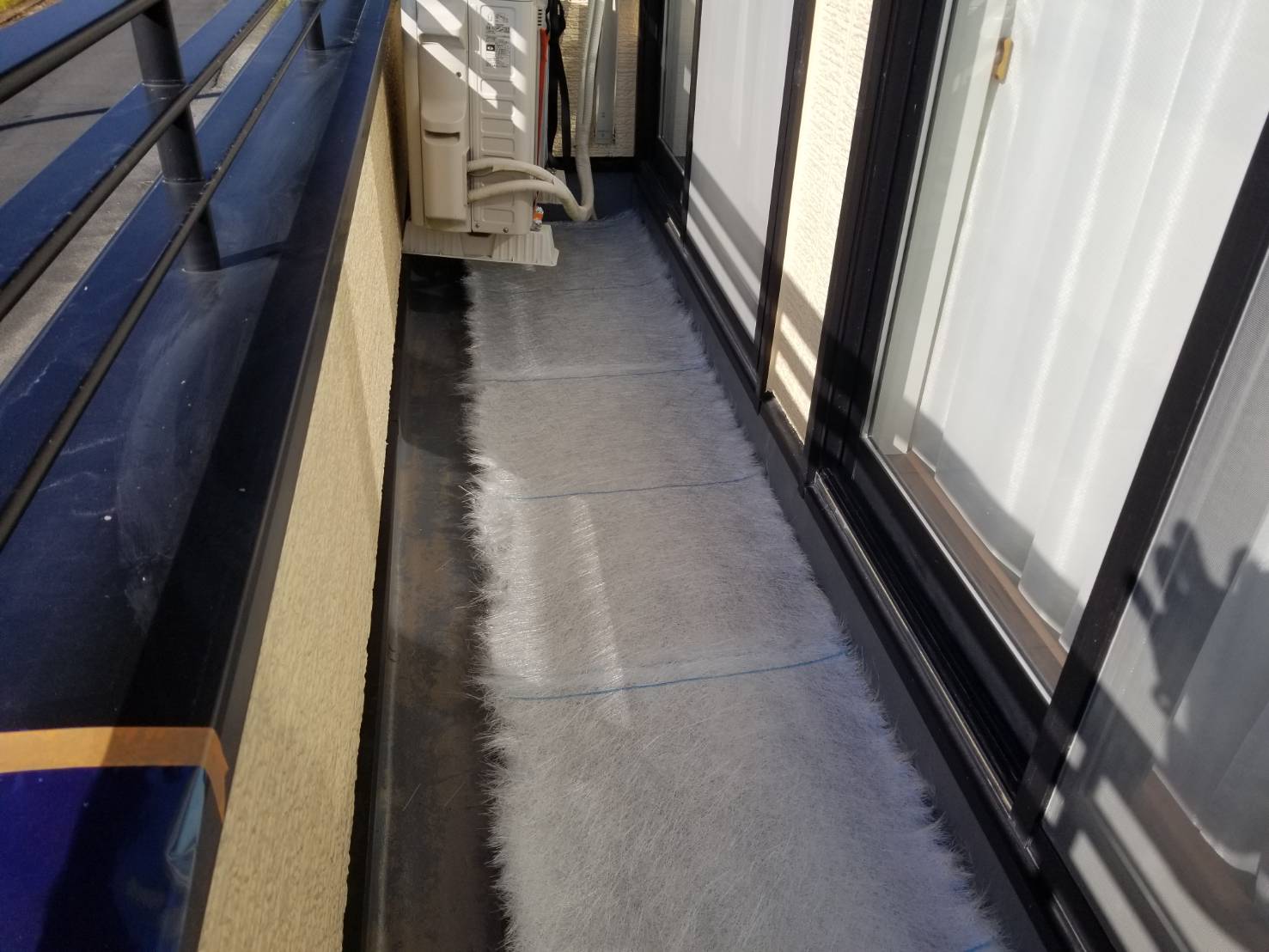 FRP防水の塗膜がひび割れしていたので塗膜の上にガラスマットをひいてからの施工になります。
