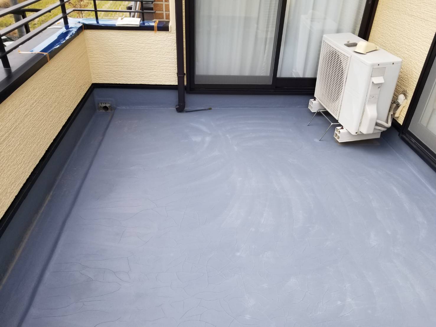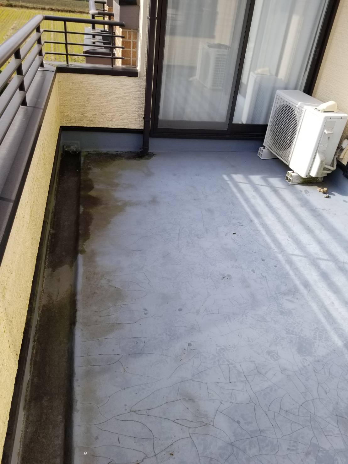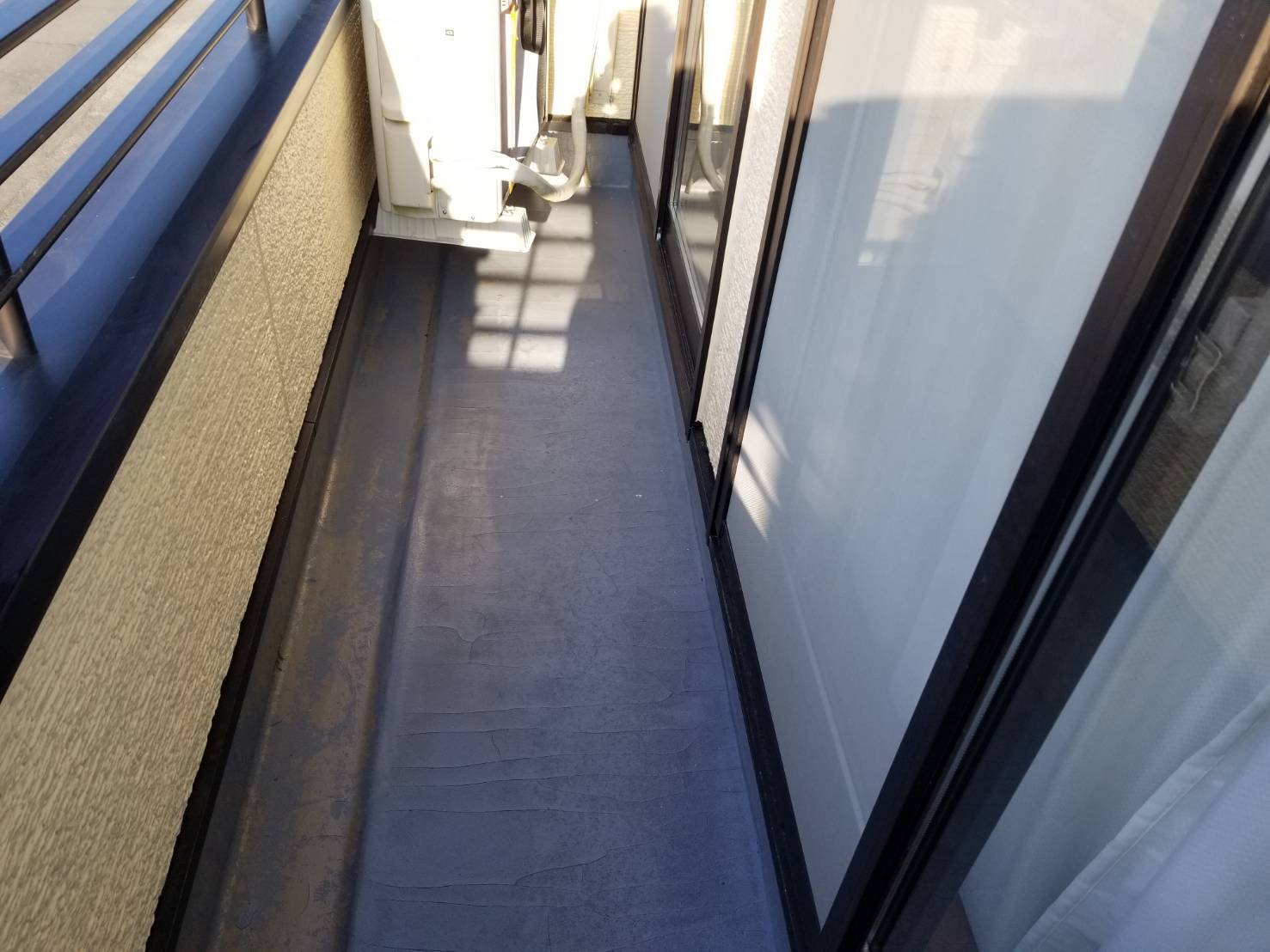 FRP防水の塗膜がひび割れしていたので塗膜の上にガラスマットをひいてからの施工になります。
